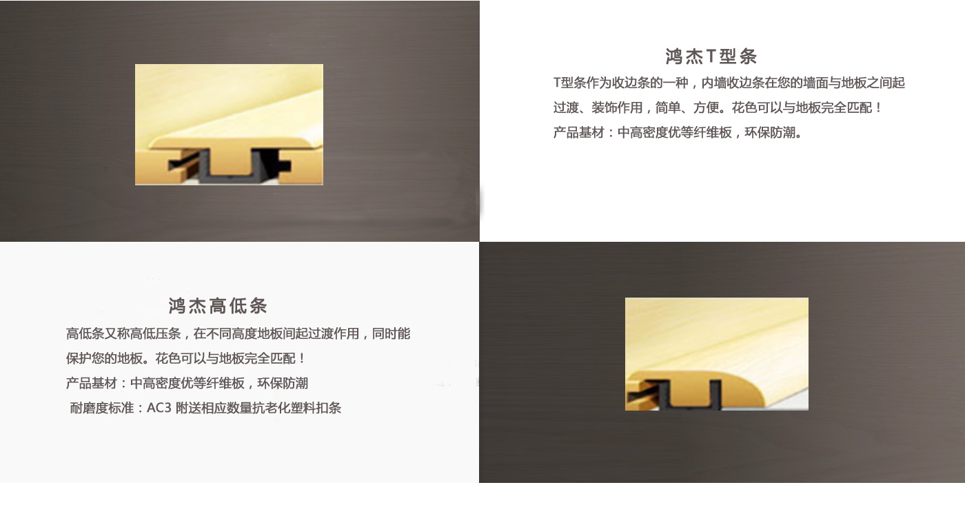 專業(yè)生產(chǎn)各類地板輔料。本廠成立于2008年,經(jīng)過(guò)嚴(yán)格的質(zhì)量控制,已開發(fā)出SPC、WPC、層壓板三種不同的壓花材料。每一種材料都有超過(guò)7種不同的過(guò)渡型材,如t型線、減速器、端蓋、四分之一圓、樓梯前鼻、樓梯板、踢腳板等。